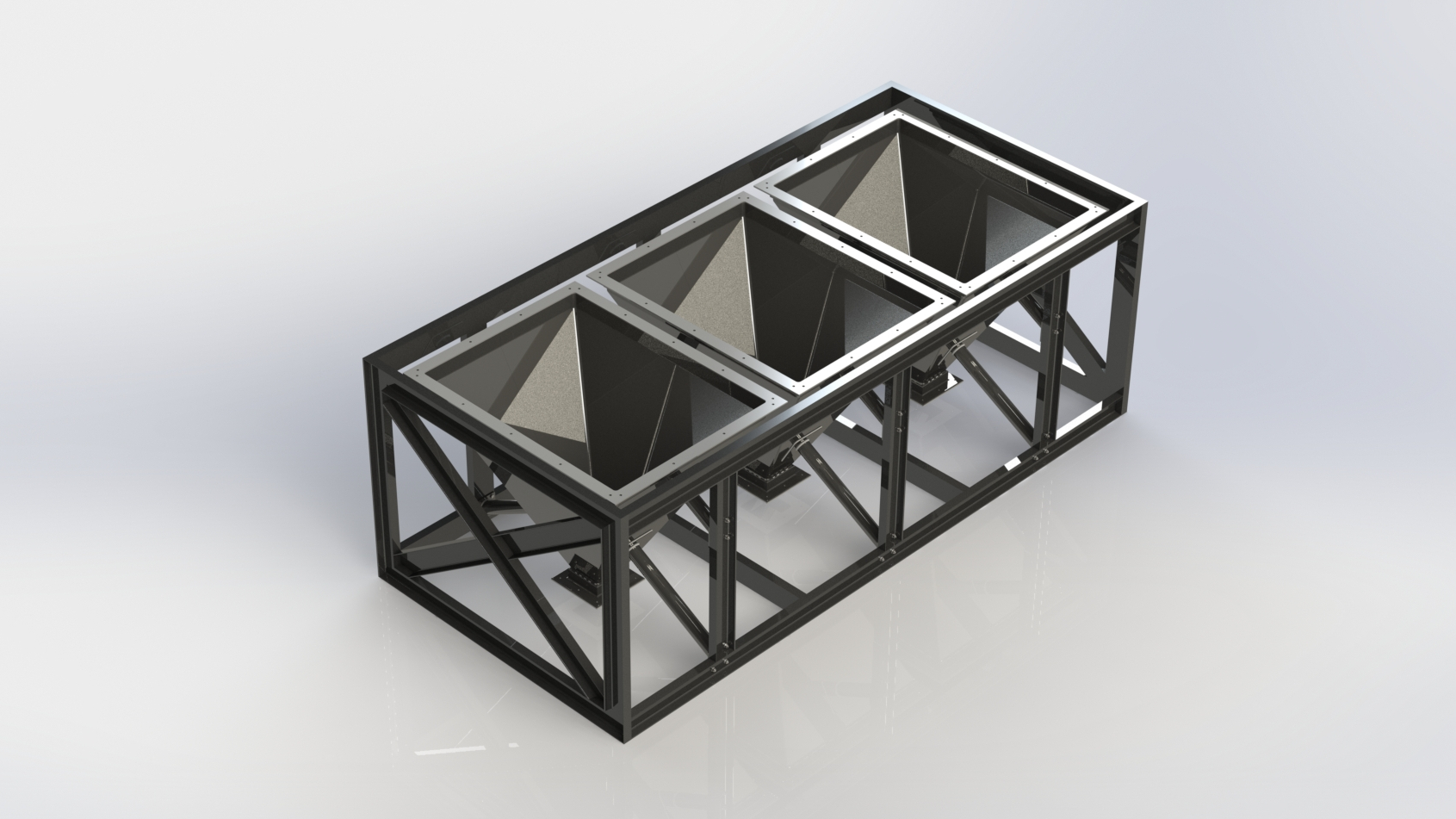 - Three hopper unit. Funnelling to a 300mm x 300mm square opening.